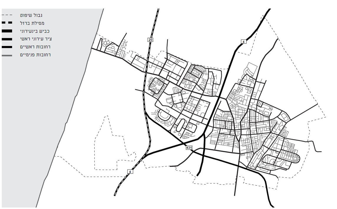 ראשון לציון, הפרדה בין המרקם הוותיק של העיר לבין השכונות החדשות שקמו בשנות התשעים. איור: